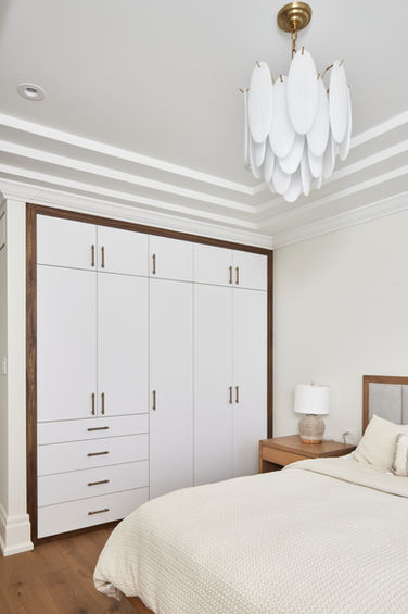 This bungalow was transformed by adding 400 sq ft to the basement and extending the master bedroom and ensuite. We removed the garage, expanded the main floor, and added 8 feet to create a new laundry and mudroom, connecting to a double car garage. Inside, a feature wall greets you, and the kitchen, designed by The Wright Kitchen, combines elegance and functionality. The master suite features a walk-in closet, hardwood floors, and a two-tone feature wall. The ensuite boasts a standing tub, walk-in shower, and custom vanity for a luxurious retreat.